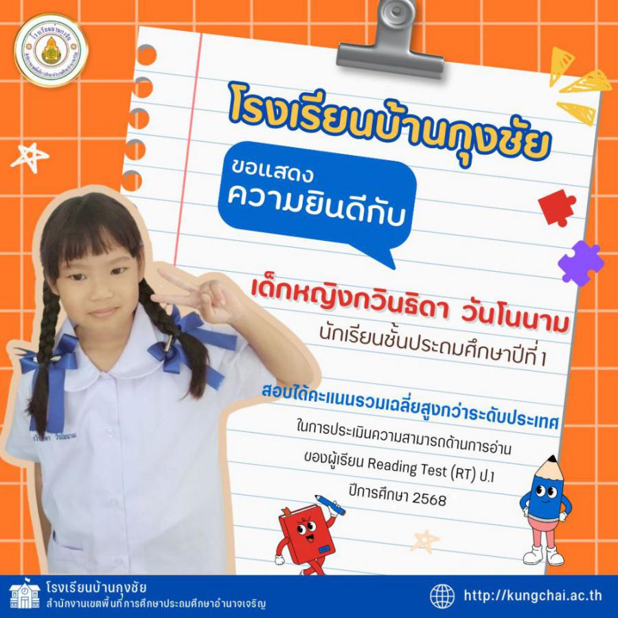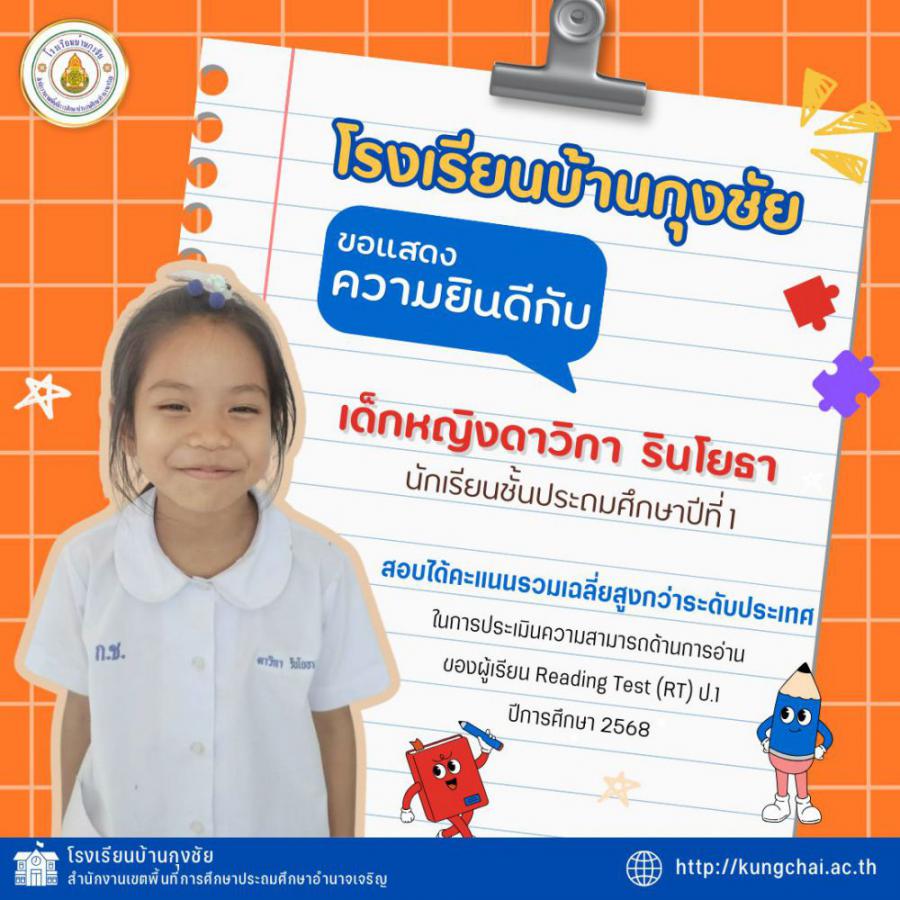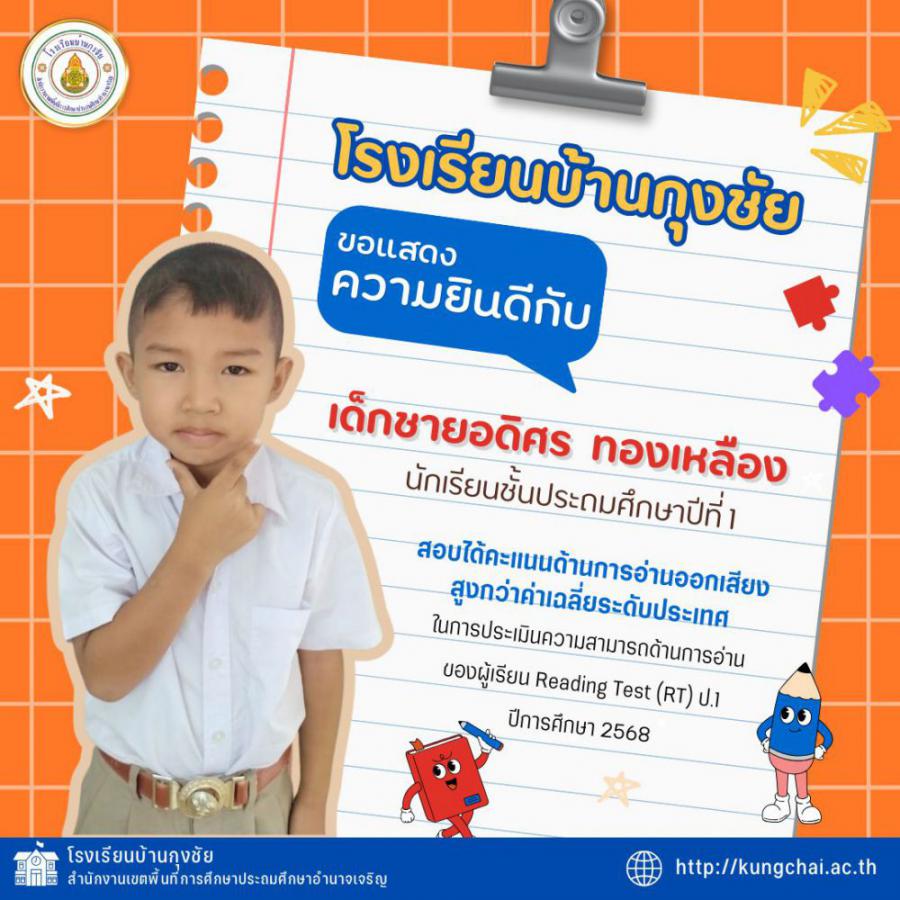 โรงเรียนบ้านกุงชัย ขอแสดงความยินดีกับนักเรียนชั้นประถมศึกษาปีที่ 1 ที่มีผลการทดสอบเพื่อประเมินความสามารถด้านการอ่าน (RT) ประจำปีการศึกษา 2568 อยู่ในระดับที่น่าภาคภูมิใจ การประเมิน RT ประกอบด้วย 2 ด้าน ได้แก่ การอ่านออกเสียง และการอ่านรู้เรื่อง โดยภาพรวมทั้ง 2 ด้าน นักเรียนหลายคนมีผลคะแนนสูงกว่าระดับประเทศ ความสำเร็จในครั้งนี้เกิดจากความตั้งใจของนักเรียน การจัดการเรียนรู้ของคณะครู และความร่วมมือจากผู้ปกครองทุกท่าน โรงเรียนมุ่งมั่นพัฒนาทักษะการอ่านทั้งด้านการอ่านออกเสียงและการอ่านรู้เรื่องอย่างต่อเนื่อง เพื่อยกระดับคุณภาพการศึกษาให้ดียิ่งขึ้น S:0