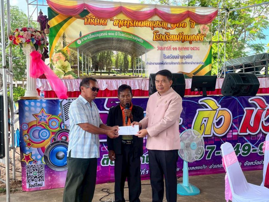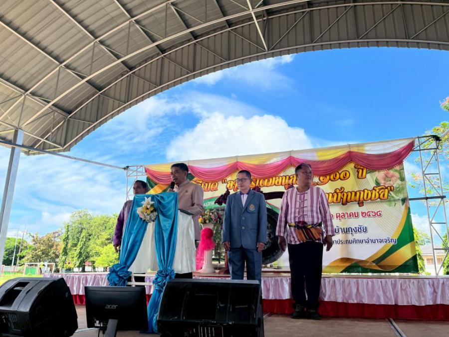 งานผ้าป่าเพื่อการศึกษาและพิธีเปิดอาคาร ?โดมอนุสรณ์ 100 ปี? วันที่ 11 ตุลาคม 2568 โรงเรียนบ้านกุงชัย นำโดย นายไพโรจน์ ใจดี ผู้อำนวยการโรงเรียนบ้านกุงชัย พร้อมด้วยคณะครู บุคลากรทางการศึกษา ศิษย์เก่า และชุมชนในพื้นที่ ได้ร่วมกันจัดงาน ผ้าป่าเพื่อการศึกษา และพิธีเปิดป้ายอาคาร ?โดมอนุสรณ์ 100 ปี? เพื่อเฉลิมฉลองวาระครบรอบ 100 ปีแห่งการก่อตั้งโรงเรียน โดยได้รับเกียรติจาก นายพิทยา นามบุญลือ ผู้อำนวยการสำนักงานเขตพื้นที่การศึกษาประถมศึกษาอำนาจเจริญ เป็นประธานในพิธี พร้อมด้วย นายไกยูล เกษสุพรรณ์ รองผู้อำนวยการสำนักงานเขตพื้นที่การศึกษาประถมศึกษาอำนาจเจริญ ร่วมเป็นประธานในพิธี บรรยากาศภายในงานเป็นไปอย่างอบอุ่น ร่มรื่น และเปี่ยมด้วยความภาคภูมิใจของทุกภาคส่วน ทั้งคณะครู ศิษย์เก่า และชุมชน ที่ร่วมแรงร่วมใจเพื่อพัฒนาโรงเรียนบ้านกุงชัยให้เป็นศูนย์กลางแห่งการเรียนรู้ที่มั่นคงสืบไป S:0