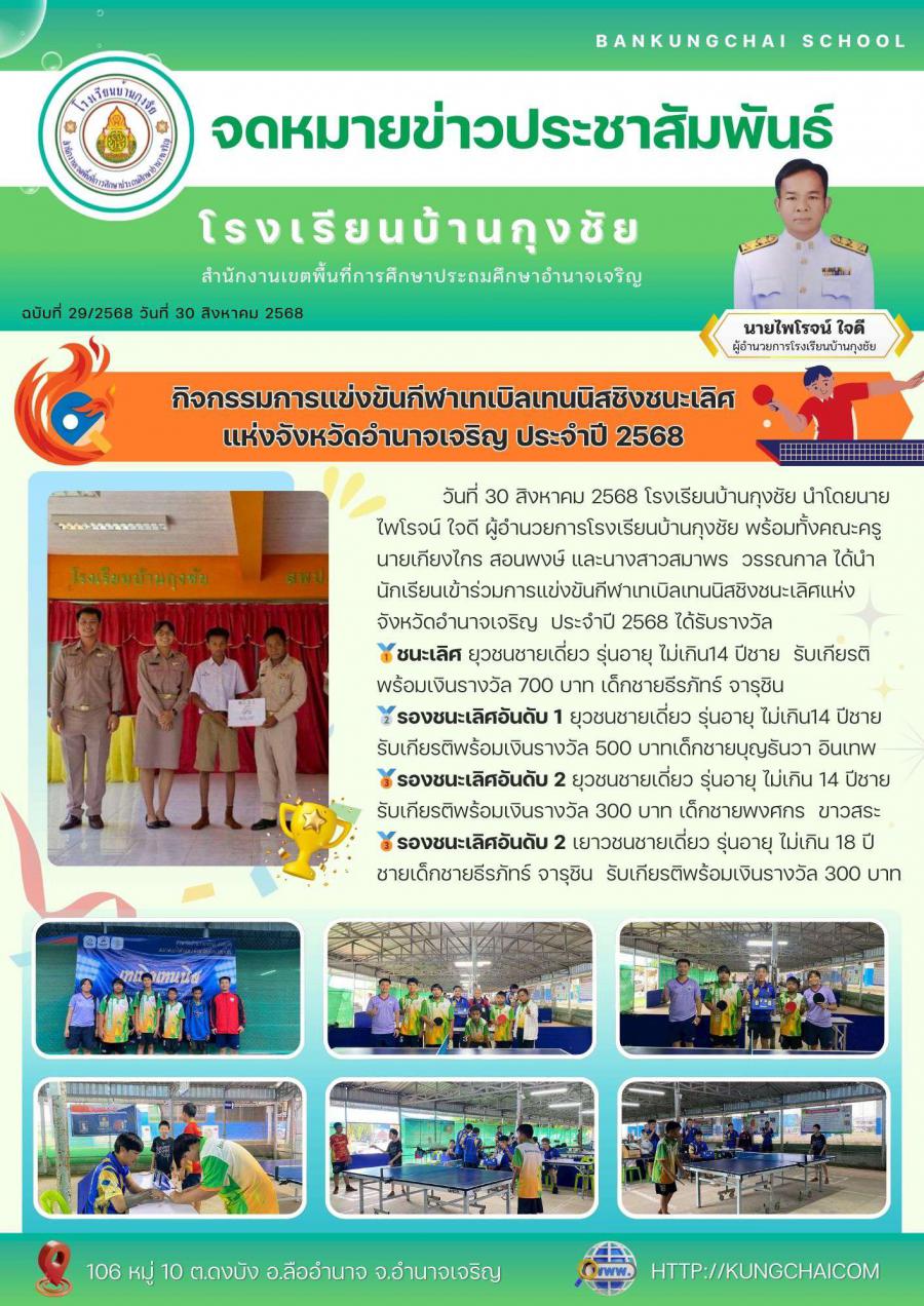 โรงเรียนบ้านกุงชัยนำโดยนายไพโรจน์ ใจดี ผู้อำนวยการโรงเรียนบ้านกุงชัย พร้อมทั้งคณะครูนายเกียงไกร สอนพงษ์ และนางสาวสมาพร วรรณกาล ได้นำนักเรียนเข้าร่วมการแข่งขันกีฬาเทเบิลเทนนิสชิงชนะเลิศแห่งจังหวัดอำนาจเจริญ ประจำปี 2568ได้รับรางวัล