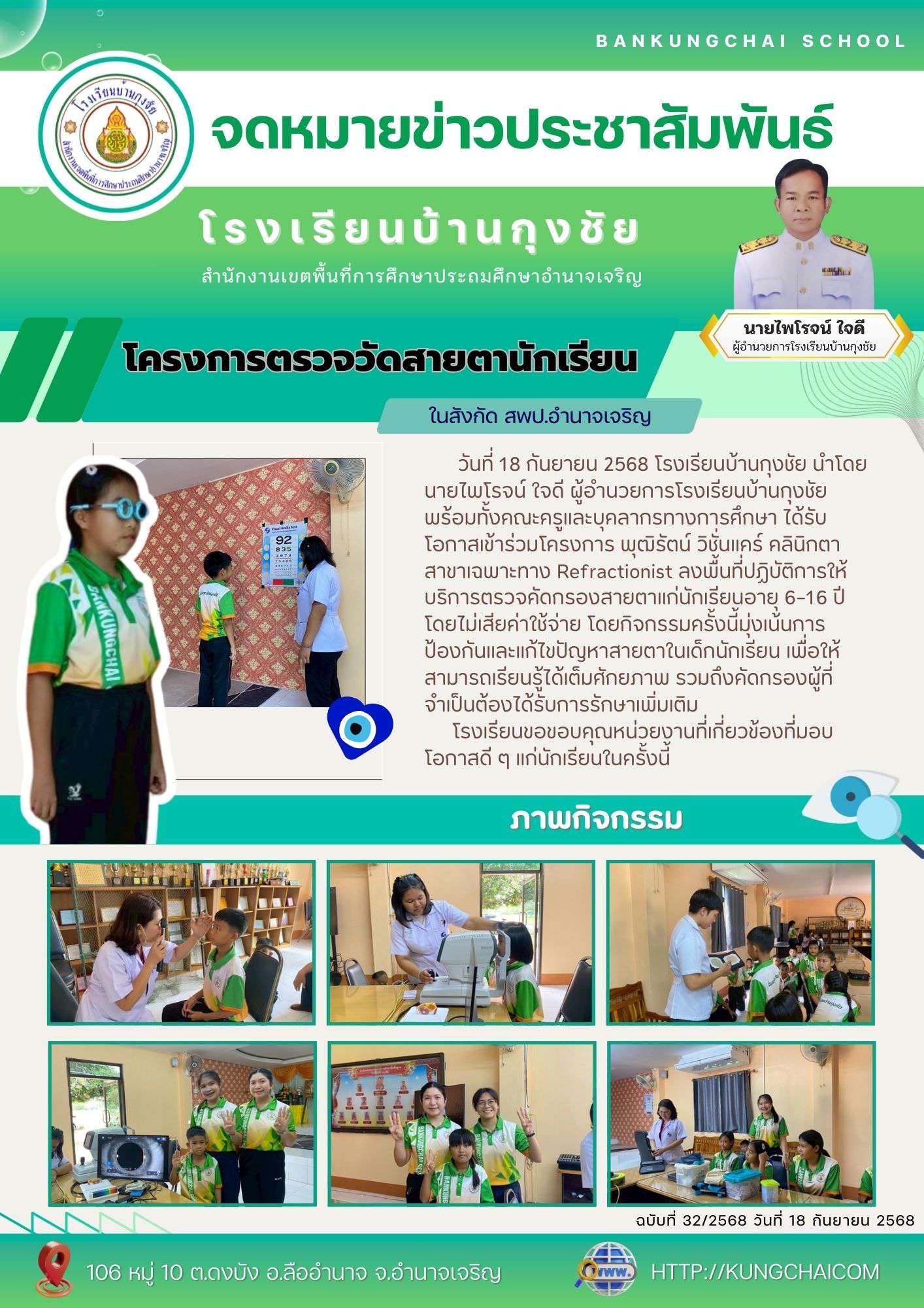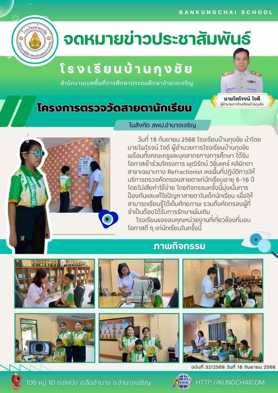 โรงเรียนบ้านกุงชัยนำโดยนายไพโรจน์ ใจดี ผู้อำนวยการโรงเรียนบ้านกุงชัย พร้อมทั้งคณะครูและบุคลากรทางการศึกษา ได้รับโอกาสเข้าร่วมโครงการ พุฒิรัตน์ วิชั่นแคร์ คลินิกตาสาขาเฉพาะทาง Refractionist ลงพื้นที่ปฏิบัติการให้บริการตรวจคัดกรองสายตาแก่นักเรียนอายุ 6–16 ปี โดยไม่เสียค่าใช้จ่าย โดยกิจกรรมครั้งนี้มุ่งเน้นการป้องกันและแก้ไขปัญหาสายตาในเด็กนักเรียน เพื่อให้สามารถเรียนรู้ได้เต็มศักยภาพ รวมถึงคัดกรองผู้ที่จำเป็นต้องได้รับการรักษาเพิ่มเติม
