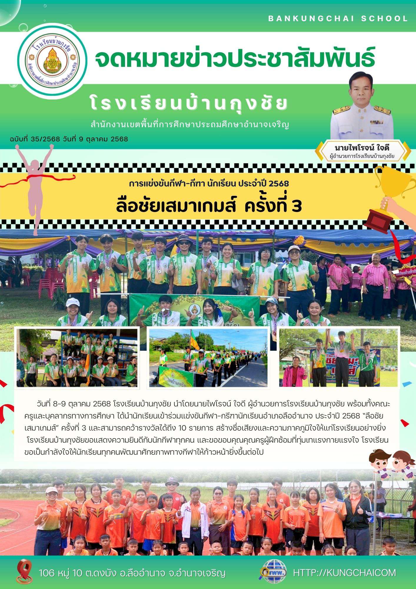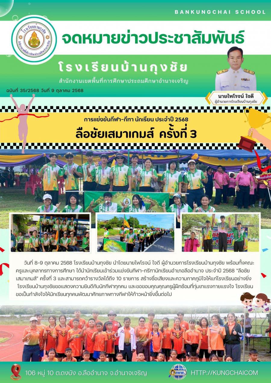 นำโดยนายไพโรจน์ ใจดี ผู้อำนวยการโรงเรียนบ้านกุงชัย พร้อมทั้งคณะครูและบุคลากรทางการศึกษา ได้นำนักเรียนเข้าร่วมแข่งขันกีฬา-กรีฑานักเรียนอำเภอลืออำนาจ ประจำปี 2568 “ลือชัยเสมาเกมส์” ครั้งที่ 3 และสามารถคว้ารางวัลได้ถึง 10 รายการสร้างชื่อเสียงและความภาคภูมิใจให้แก่โรงเรียนอย่างยิ่ง