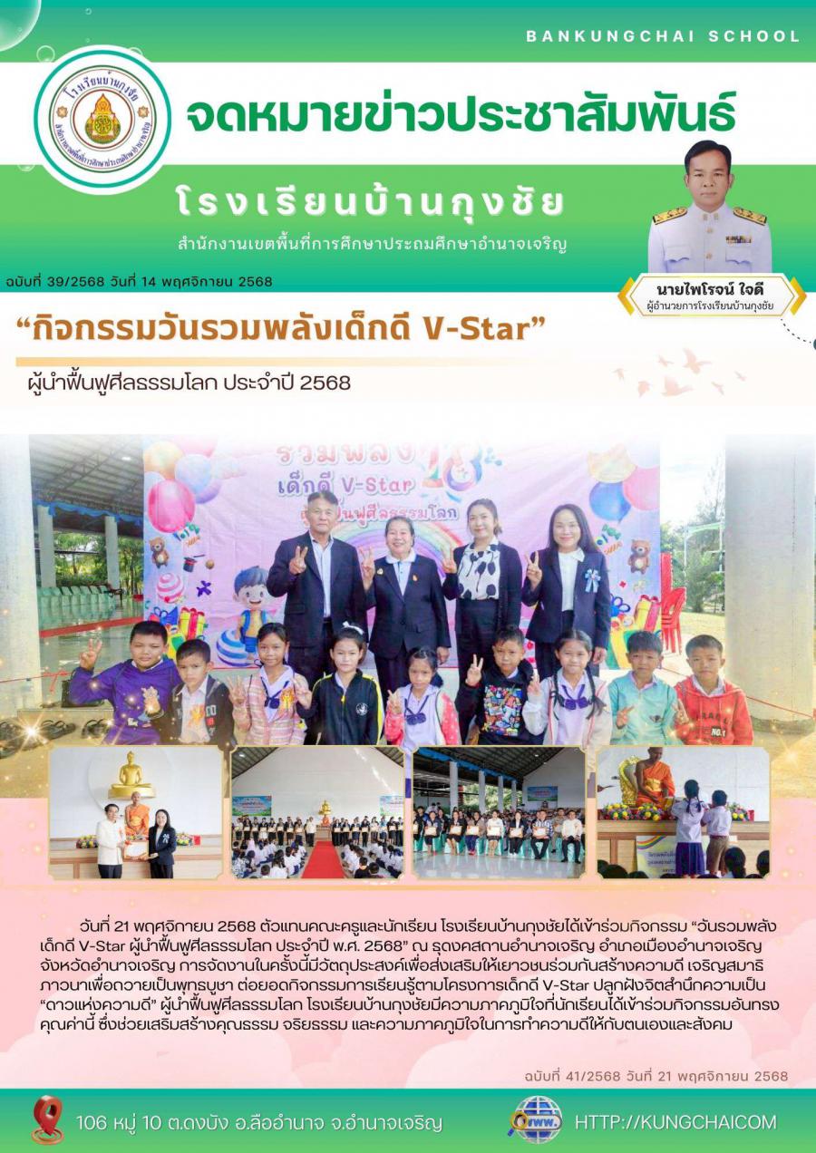 วันที่ 21 พฤศจิกายน 2568 ตัวแทนคณะครูและนักเรียน โรงเรียนบ้านกุงชัยได้เข้าร่วมกิจกรรม “วันรวมพลังเด็กดี V-Star ผู้นำฟื้นฟูศีลธรรมโลก ประจำปี พ.ศ. 2568” ณ ธุดงคสถานอำนาจเจริญ อำเภอเมืองอำนาจเจริญ จังหวัดอำนาจเจริญ การจัดงานในครั้งนี้มีวัตถุประสงค์เพื่อส่งเสริมให้เยาวชนร่วมกันสร้างความดี เจริญสมาธิภาวนาเพื่อถวายเป็นพุทธบูชา ต่อยอดกิจกรรมการเรียนรู้ตามโครงการเด็กดี V-Star ปลูกฝังจิตสำนึกความเป็น “ดาวแห่งความดี” ผู้นำฟื้นฟูศีลธรรมโลก โรงเรียนบ้านกุงชัยมีความภาคภูมิใจที่นักเรียนได้เข้าร่วมกิจกรรมอันทรงคุณค่านี้ ซึ่งช่วยเสริมสร้างคุณธรรม จริยธรรม และความภาคภูมิใจในการทำความดีให้กับตนเองและสังคม