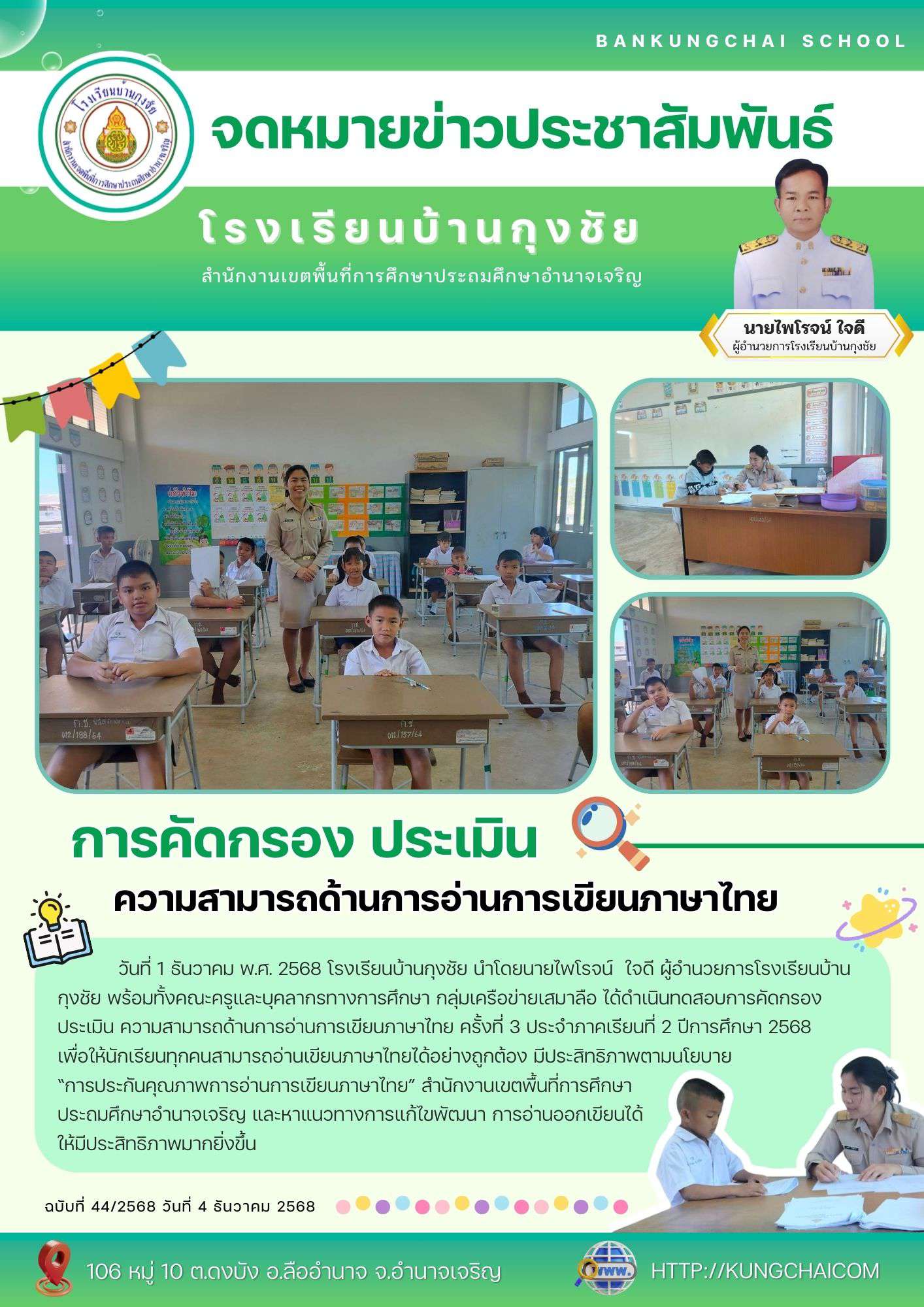 วันที่ 1 ธันวาคม พ.ศ. 2568 โรงเรียนบ้านกุงชัย นำโดยนายไพโรจน์ ใจดี ผู้อำนวยการโรงเรียนบ้านกุงชัย พร้อมทั้งคณะครูและบุคลากรทางการศึกษา กลุ่มเครือข่ายเสมาลือ ได้ดำเนินทดสอบการคัดกรอง ประเมิน ความสามารถด้านการอ่านการเขียนภาษาไทย ครั้งที่ 3 ประจำภาคเรียนที่ 2 ปีการศึกษา 2568 เพื่อให้นักเรียนทุกคนสามารถอ่านเขียนภาษาไทยได้อย่างถูกต้อง มีประสิทธิภาพตามนโยบาย “การประกันคุณภาพการอ่านการเขียนภาษาไทย” สำนักงานเขตพื้นที่การศึกษาประถมศึกษาอำนาจเจริญ และหาแนวทางการแก้ไขพัฒนา การอ่านออกเขียนได้ ให้มีประสิทธิภาพมากยิ่งขึ้น