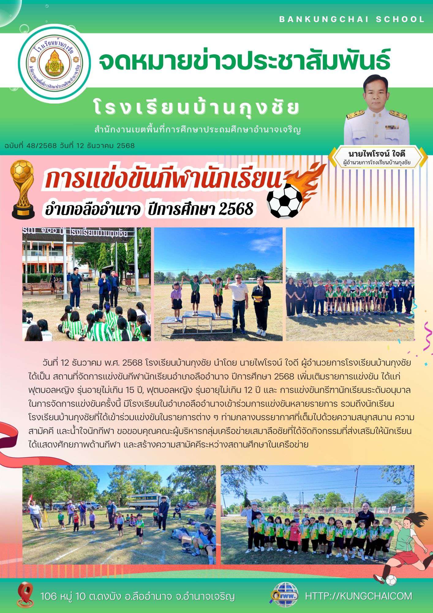วันที่ 12 ธันวาคม พ.ศ. 2568 โรงเรียนบ้านกุงชัย นำโดย นายไพโรจน์ ใจดี ผู้อำนวยการโรงเรียนบ้านกุงชัย ได้เป็น สถานที่จัดการแข่งขันกีฬานักเรียนอำเภอลืออำนาจ ปีการศึกษา 2568 เพิ่มเติมรายการแข่งขัน ได้แก่ ฟุตบอลหญิง รุ่นอายุไม่เกิน 15 ปี, ฟุตบอลหญิง รุ่นอายุไม่เกิน 12 ปี และ การแข่งขันกรีฑานักเรียนระดับอนุบาล ในการจัดการแข่งขันครั้งนี้ มีโรงเรียนในอำเภอลืออำนาจเข้าร่วมการแข่งขันหลายรายการ รวมถึงนักเรียนโรงเรียนบ้านกุงชัยที่ได้เข้าร่วมแข่งขันในรายการต่าง ๆ ท่ามกลางบรรยากาศที่เต็มไปด้วยความสนุกสนาน ความสามัคคี และน้ำใจนักกีฬา ขอขอบคุณคณะผู้บริหารกลุ่มเครือข่ายเสมาลือชัยที่ได้จัดกิจกรรมที่ส่งเสริมให้นักเรียนได้แสดงศักยภาพด้านกีฬา และสร้างความสามัคคีระหว่างสถานศึกษาในเครือข่าย