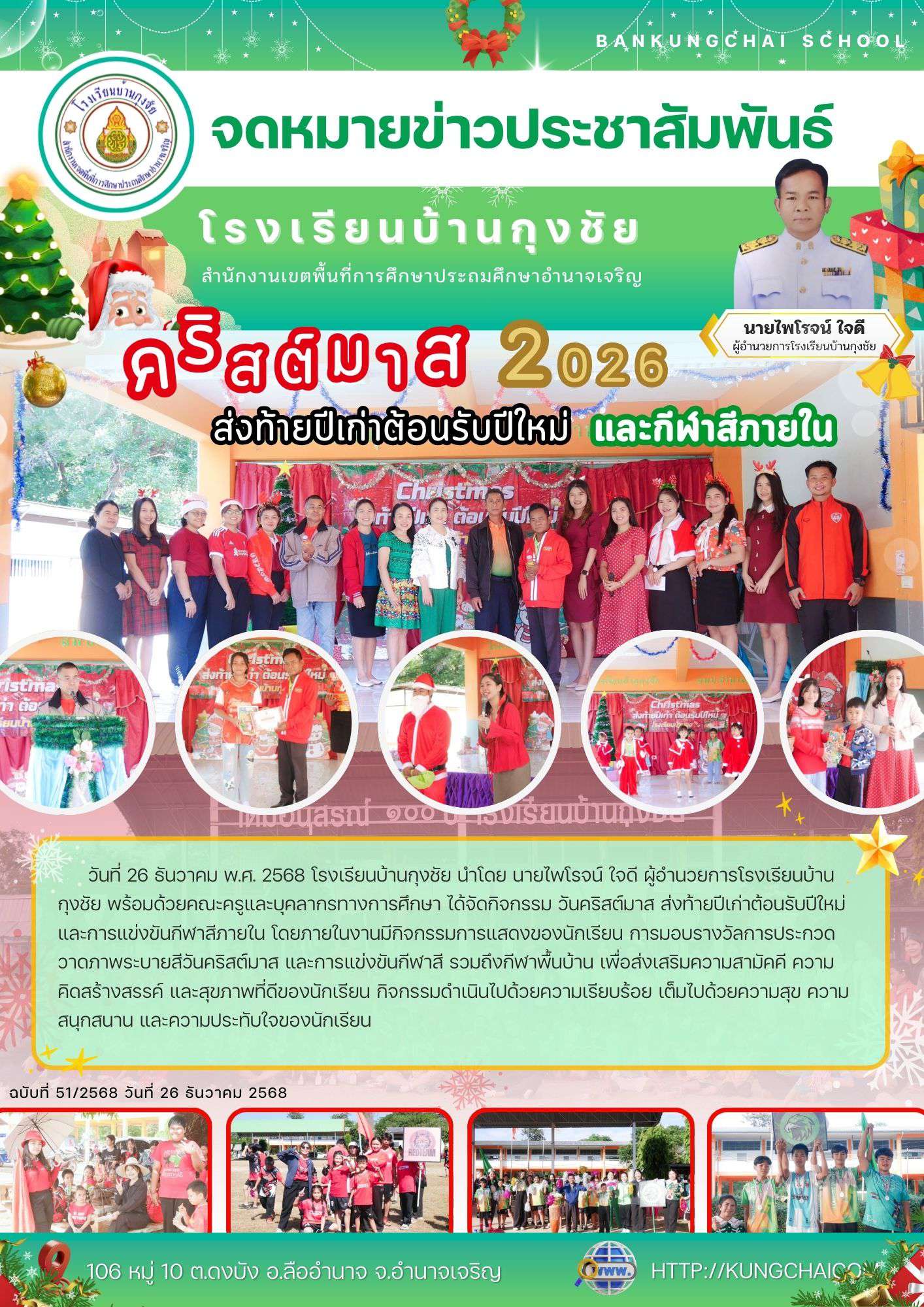 วันที่ 26 ธันวาคม พ.ศ. 2568 โรงเรียนบ้านกุงชัย นำโดย นายไพโรจน์ ใจดี ผู้อำนวยการโรงเรียนบ้านกุงชัย พร้อมด้วยคณะครูและบุคลากรทางการศึกษา ได้จัดกิจกรรม วันคริสต์มาส ส่งท้ายปีเก่าต้อนรับปีใหม่ และการแข่งขันกีฬาสีภายใน โดยภายในงานมีกิจกรรมการแสดงของนักเรียน การมอบรางวัลการประกวด วาดภาพระบายสีวันคริสต์มาส และการแข่งขันกีฬาสี รวมถึงกีฬาพื้นบ้าน เพื่อส่งเสริมความสามัคคี ความคิดสร้างสรรค์ และสุขภาพที่ดีของนักเรียน กิจกรรมดำเนินไปด้วยความเรียบร้อย เต็มไปด้วยความสุข ความสนุกสนาน และความประทับใจของนักเรียน