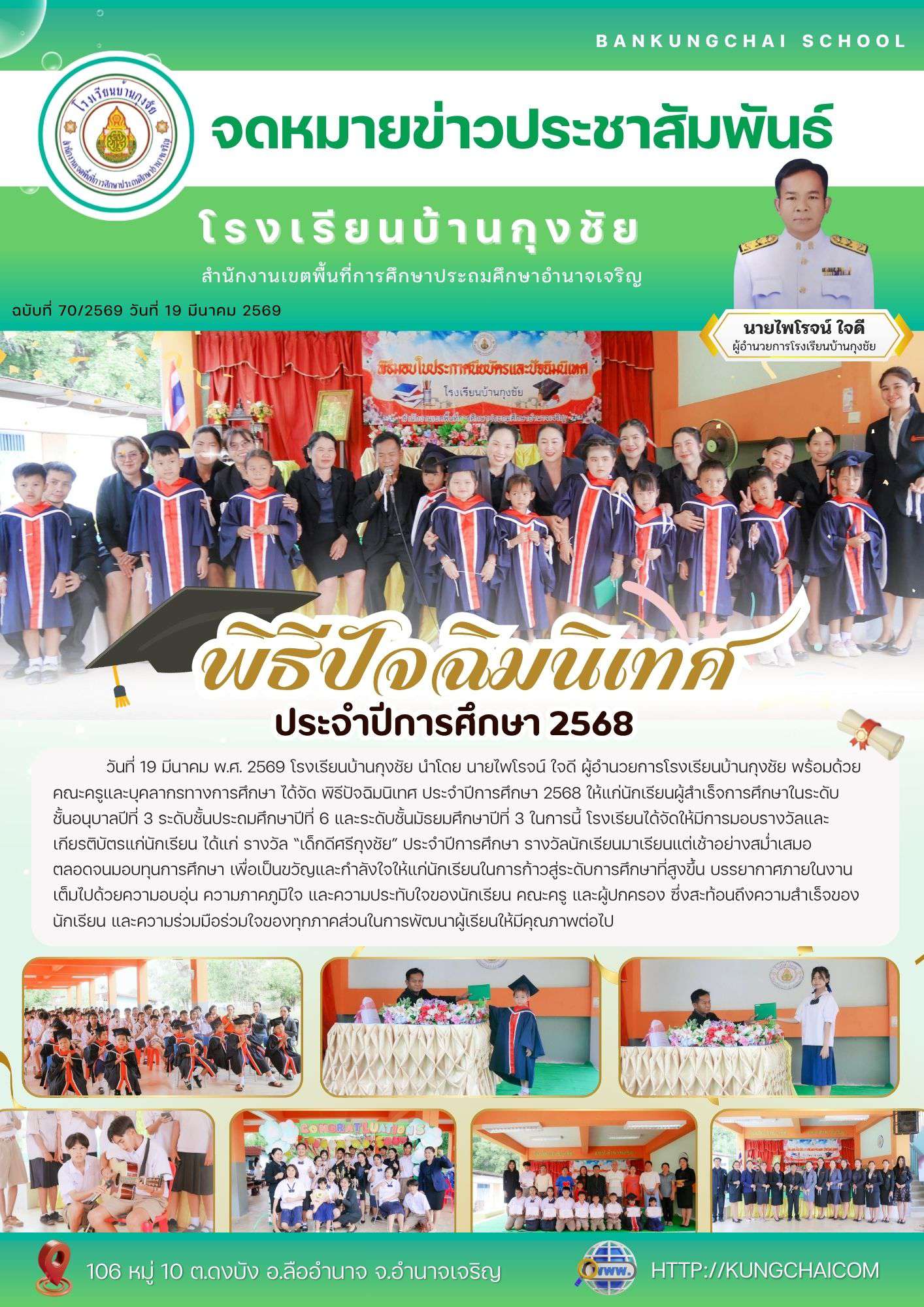 นำโดย นายไพโรจน์ ใจดี ผู้อำนวยการโรงเรียนบ้านกุงชัย พร้อมด้วยคณะครูและบุคลากรทางการศึกษา ได้จัด พิธีปัจฉิมนิเทศ ให้แก่นักเรียนผู้สำเร็จการศึกษา ระดับชั้นอนุบาลปีที่ 3 ระดับชั้นประถมศึกษาปีที่ 6 และระดับชั้นมัธยมศึกษาปีที่ 3 ในการนี้ โรงเรียนได้จัดให้มีการมอบรางวัลและเกียรติบัตรแก่นักเรียน ได้แก่ รางวัล “เด็กดีศรีกุงชัย” ประจำปีการศึกษา รางวัลนักเรียนมาเรียนแต่เช้าอย่างสม่ำเสมอ และมอบทุนการศึกษา เพื่อเป็นขวัญและกำลังใจให้แก่นักเรียนในการก้าวสู่ระดับการศึกษาที่สูงขึ้นบรรยากาศภายในงานเต็มไปด้วยความอบอุ่น ความภาคภูมิใจ และความประทับใจของนักเรียน คณะครู และผู้ปกครอง ซึ่งสะท้อนถึงความสำเร็จของนักเรียน และความร่วมมือร่วมใจของทุกภาคส่วนในการพัฒนาผู้เรียนให้มีคุณภาพต่อไป