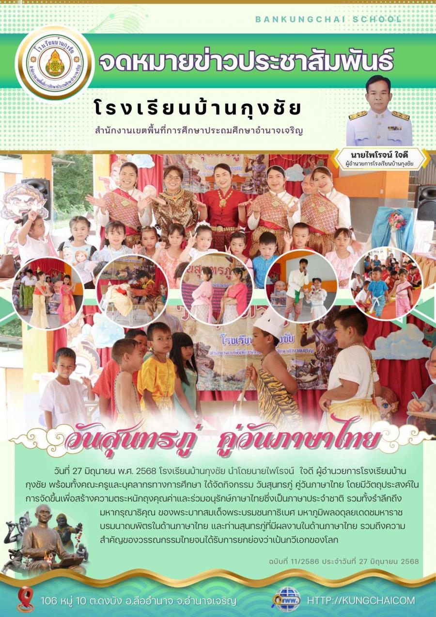 ผู้อำนวยการโรงเรียนบ้านกุงชัย พร้อมทั้งคณะครูและบุคลากรทางการศึกษา ได้จัดกิจกรรม วันสุนทรภู่ คู่วันภาษาไทย โดยมีวัตถุประสงค์ในการจัดขึ้นเพื่อสร้างความตระหนักถุงคุณค่าและร่วมอนุรักษ์ภาษาไทยซึ่งเป็นภาษาประจำชาติ รวมทั้งรำลึกถึงมหากรุณาธิคุณ ของพระบาทสมเด็จพระบรมชนกาธิเบศ มหาภูมิพลอดุลยเดดชมหาราช บรมนาถบพิตรในด้านภาษาไทย และท่านสุนทรภู่ที่มีผลงานในด้านภาษาไทย รวมถึงความสำคัญของวรรณกรรมไทยจนได้รับการยกย่องว่าเป็นกวีเอกของโลก
