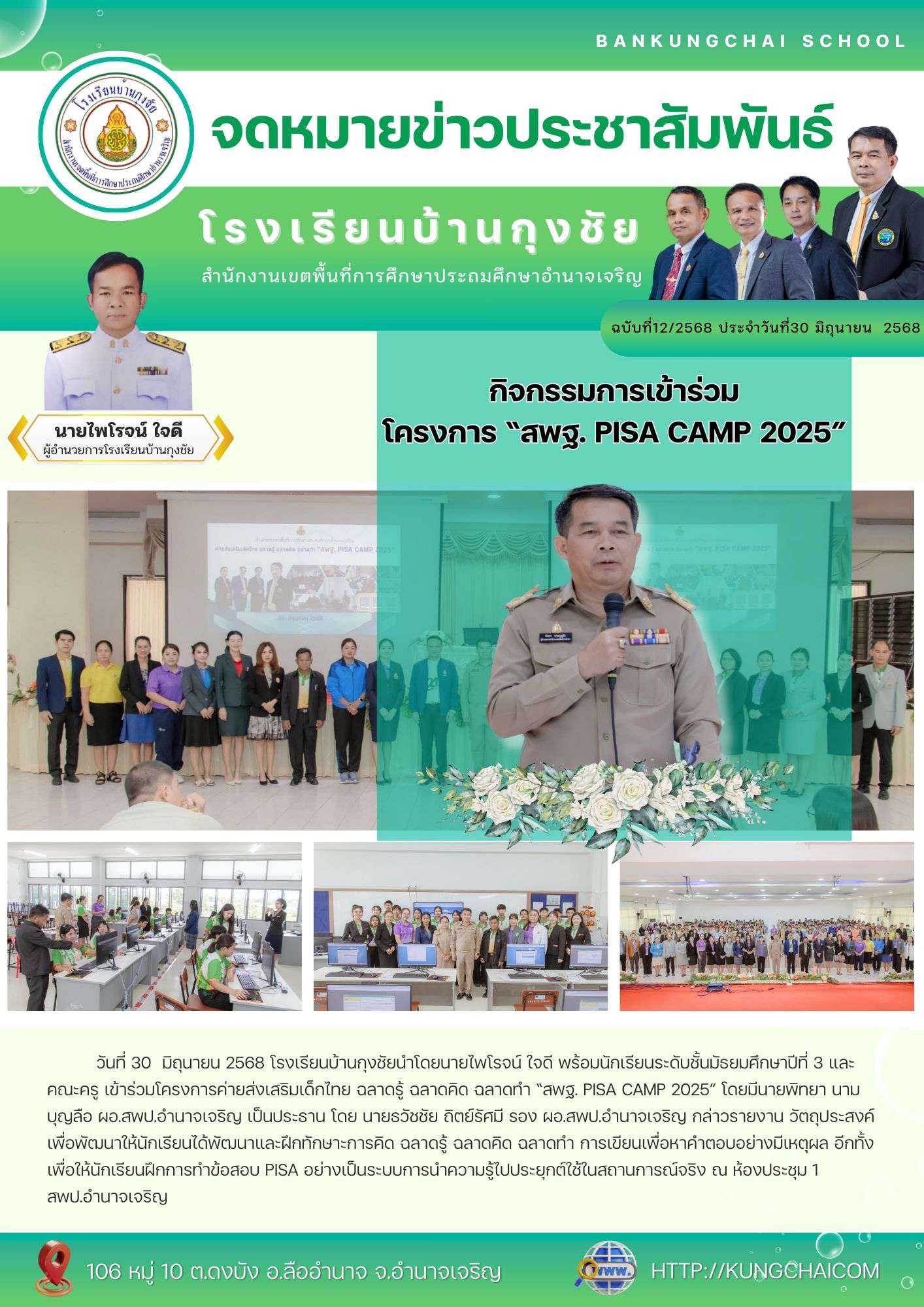 โรงเรียนบ้านกุงชัยนำโดยนายไพโรจน์ ใจดี ผู้อำนวยการโรงเรียนบ้านกุงชัย พร้อมทั้งคณะครูและบุคลากรทางการศึกษา ได้นำนักเรียนระดับชั้นมัธยมศึกษาปีที่ 3 เข้าร่วมโครงการค่ายส่งเสริมเด็กไทย ฉลาดรู้ ฉลาดคิด ฉลาดทำ “สพฐ. PISA CAMP 2025” โดยมีนายพิทยา นามบุญลือ ผอ.สพป.อำนาจเจริญ เป็นประธาน โดย นายธวัชชัย ถิตย์รัศมี รอง ผอ.สพป.อำนาจเจริญ กล่าวรายงาน วัตถุประสงค์เพื่อพัฒนาให้นักเรียนได้พัฒนาและฝึกทักษาะการคิด ฉลาดรู้ ฉลาดคิด ฉลาดทำ การเขียนเพื่อหาคำตอบอย่างมีเหตุผล อีกทั้ง เพื่อให้นักเรียนฝึกการทำข้อสอบ PISA อย่างเป็นระบบการนำความรู้ไปประยุกต์ใช้ในสถานการณ์จริง ณ ห้องประชุม 1 สพป.อำนาจเจริญ
