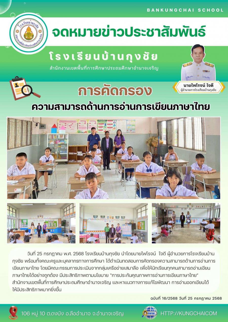 โรงเรียนบ้านกุงชัยนำโดยนายไพโรจน์ ใจดี ผู้อำนวยการโรงเรียนบ้านกุงชัย พร้อมทั้งคณะครูและบุคลากรทางการศึกษา ได้ดำเนินทดสอบการคัดกรองความสามารถด้านการอ่านการเขียนภาษาไทย โดยมีคณะกรรมการประเมินจากกลุ่มเครือข่ายเสมาลือ เพื่อให้นักเรียนทุกคนสามารถอ่านเขียนภาษาไทยได้อย่างถูกต้อง มีประสิทธิภาพตามนโยบาย “การประกันคุณภาพการอ่านการเขียนภาษาไทย” สำนักงานเขตพื้นที่การศึกษาประถมศึกษาอำนาจเจริญ และหาแนวทางการแก้ไขพัฒนา การอ่านออกเขียนได้ ให้มีประสิทธิภาพมากยิ่งขึ้น