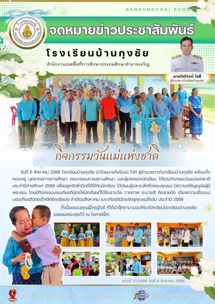 โรงเรียนบ้านกุงชัยนำโดยนายไพโรจน์ ใจดี ผู้อำนวยการโรงเรียนบ้านกุงชัย พร้อมทั้งคณะครู บุคลากรทางการศึกษา คณะกรรมการสถานศึกษา และผู้ปกครองนักเรียน ได้ร่วมกิจกรรมวันแม่แห่งชาติ ประจำปีการศึกษา 2568 เพื่อปลูกจิตสำนึกที่ดีให้กับนักเรียน ได้เรียนรู้และระลึกถึงพระคุณแม่ มีความกตัญญูต่อผู้มีพระคุณ โดยมีกิจกรรมมอบเกียรติบัตรให้นักเรียนที่ได้รับรางวัล วาดภาพ ระบายสี คัดลายมือ เรียงความเรื่องแม่ มอบเกียรติบัตรเด็กดีศรีกุงชัยประจำเดือนสิงหาคม และเกียรติบัตรเชิดชูคุณแม่ดีเด่น ประจำปี 2568