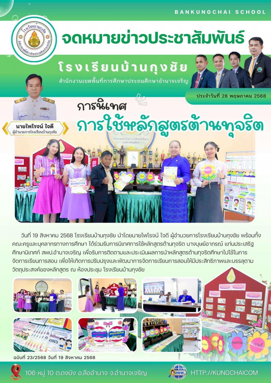 โรงเรียนบ้านกุงชัยนำโดยนายไพโรจน์ ใจดี ผู้อำนวยการโรงเรียนบ้านกุงชัย พร้อมทั้งคณะครูและบุคลากรทางการศึกษา ได้ร่วมรับการนิเทศการใช้หลักสูตรต้านทุจริต นางบุษย์อาภรณ์ แท่นประเสริฐ ศึกษานิเทศก์ สพป.อำนาจเจริญ เพื่อรับการติดตามและประเมินผลการนำหลักสูตรต้านทุจริตศึกษาไปใช้ในการจัดการเรียนการสอน เพื่อให้เกิดการปรับปรุงและพัฒนาการจัดการเรียนการสอนให้มีประสิทธิภาพและบรรลุตามวัตถุประสงค์ของหลักสูตร ณ ห้องประชุม โรงเรียนบ้านกุงชัย