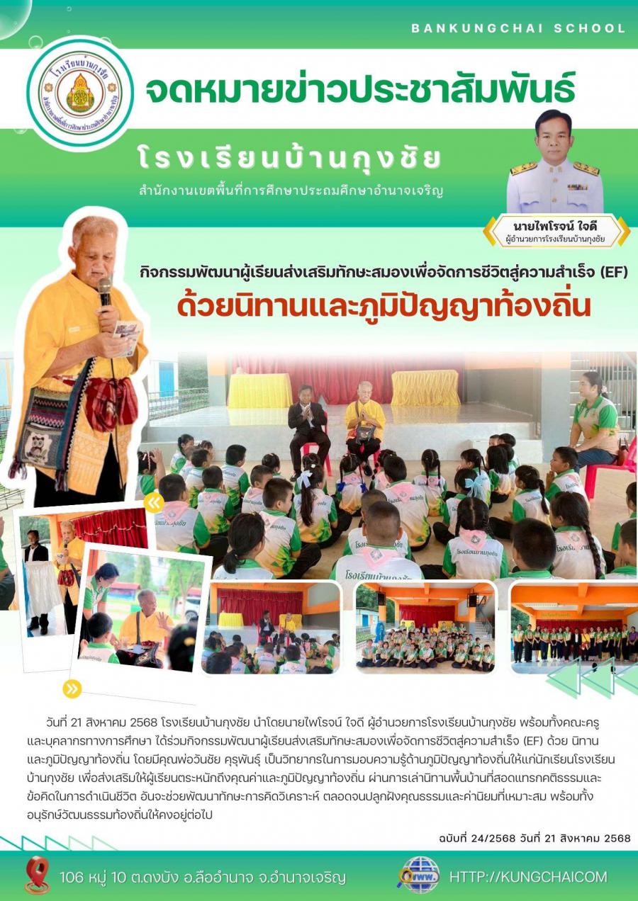 โรงเรียนบ้านกุงชัยนำโดยนายไพโรจน์ ใจดี ผู้อำนวยการโรงเรียนบ้านกุงชัย พร้อมทั้งคณะครูและบุคลากรทางการศึกษา ได้ร่วมกิจกรรมพัฒนาผู้เรียนส่งเสริมทักษะสมองเพื่อจัดการชีวิตสู่ความสำเร็จ (EF) ด้วย นิทานและภูมิปัญญาท้องถิ่น โดยมีคุณพ่อวันชัย คุรุพันธุ์ เป็นวิทยากรในการมอบความรู้ด้านภูมิปัญญาท้องถิ่นให้แก่นักเรียนโรงเรียนบ้านกุงชัย เพื่อส่งเสริมให้ผู้เรียนตระหนักถึงคุณค่าและภูมิปัญญาท้องถิ่น ผ่านการเล่านิทานพื้นบ้านที่สอดแทรกคติธรรมและข้อคิดในการดำเนินชีวิต อันจะช่วยพัฒนาทักษะการคิดวิเคราะห์ ตลอดจนปลูกฝังคุณธรรมและค่านิยมที่เหมาะสม พร้อมทั้งอนุรักษ์วัฒนธรรมท้องถิ่นให้คงอยู่ต่อไป